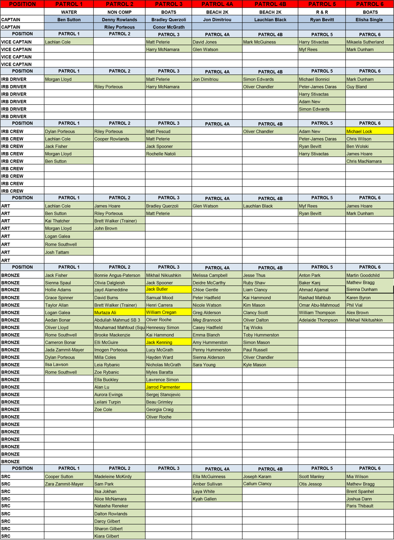 Patrol Allocation List – Patrols 1-6